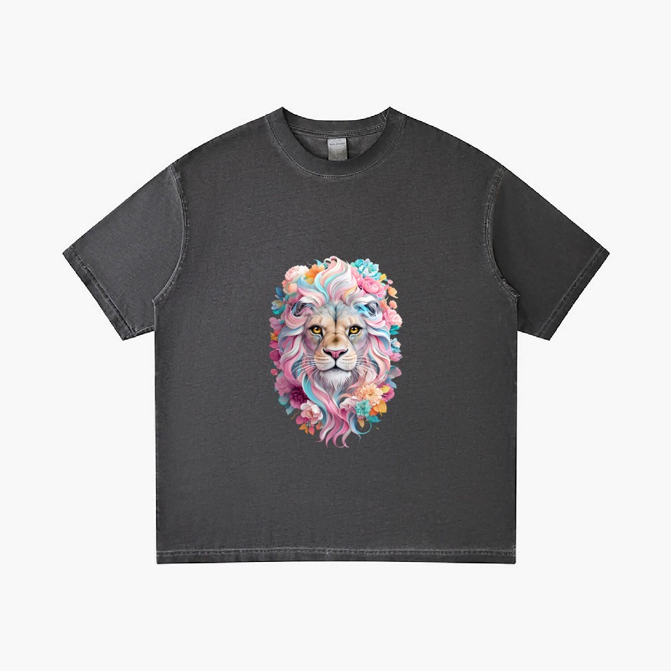 The item hot trend you're looking at is Lion Illustration Surrounded By Floral Gradient T Shirts For Men Washed Black belong theme Gradient T-Shirts at Printblur