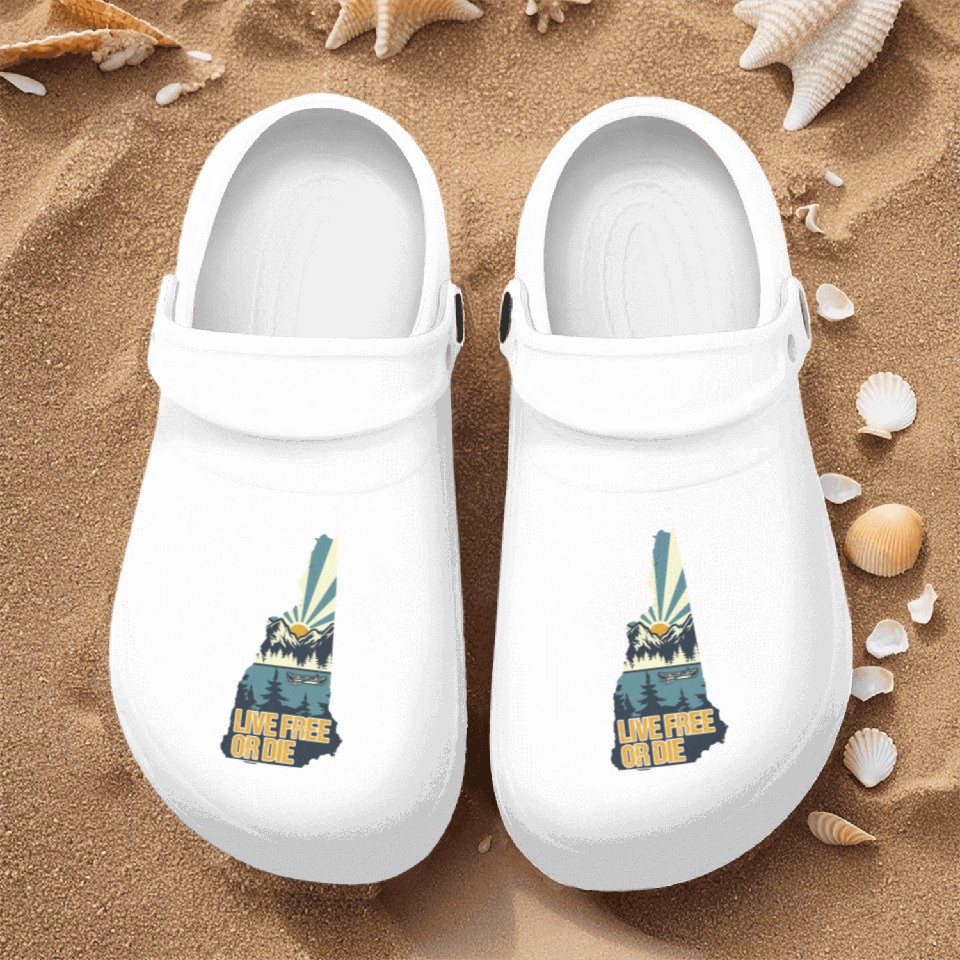 You are shopping for a stunning and trendy product Live Free or Die Retro New Hampshire Nature Nurse Clogs For Men WHITE belong theme Nurse Clogs at Printblur