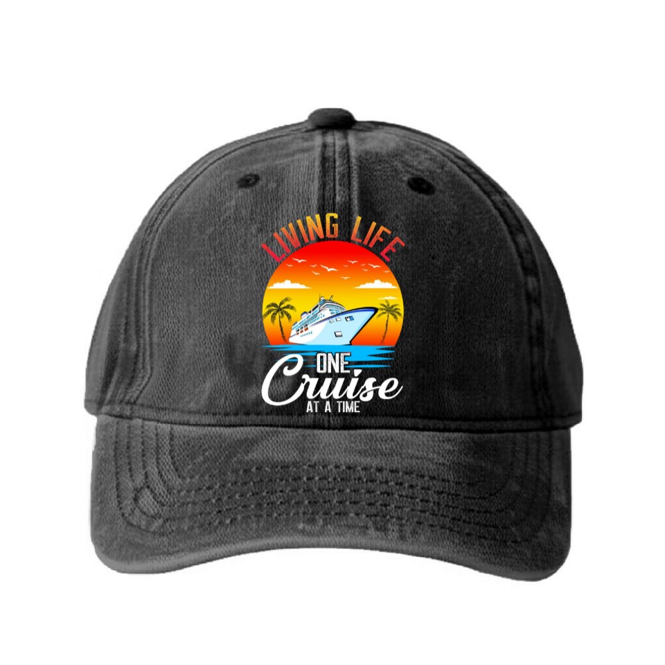 You are shopping for a stunning and trendy product Living Life One Cruise At A Time Funny Cruise Washed Denim Baseball Caps For Unisex Black belong theme Washed Denim Baseball Caps at Printblur