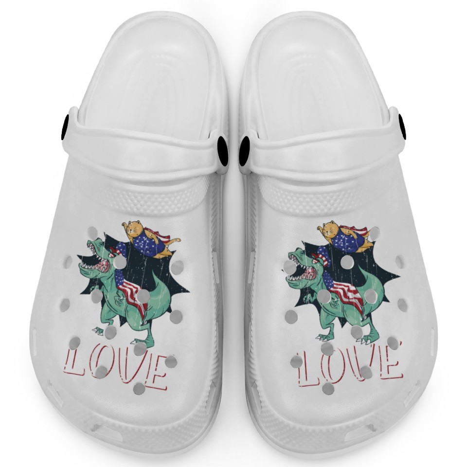 You are seeing a unique and impressive product Love America Cat Dinosaur USA Flag 4th Of July Clogs For Kids WHITE belong theme Clogs at Printblur