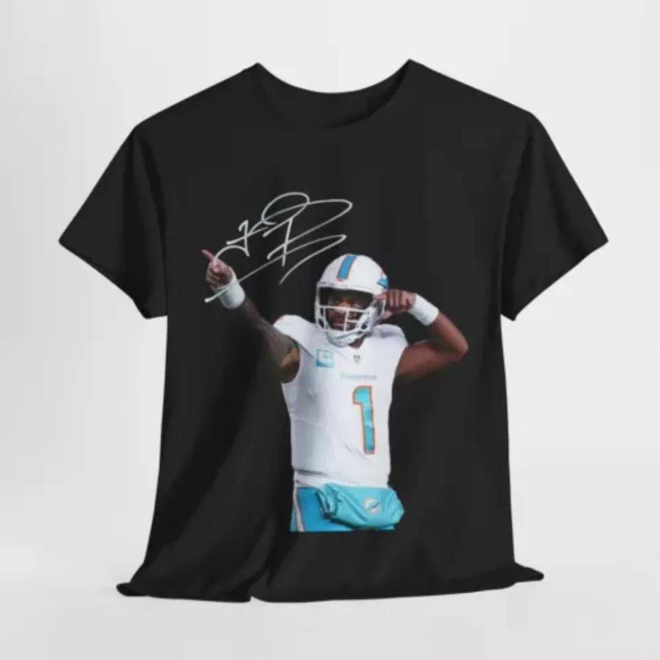 You are shopping for a stunning and trendy product Miami Tua Tagovailoa Autograph Print T-Shirt, Game Day Football T-Shirt For Men Black belong theme T-Shirts at Printblur