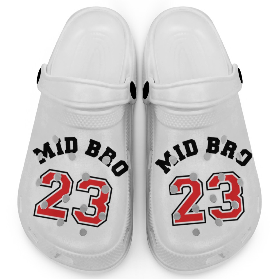 You're taking a peek at the product Mid Bro 2023 - Middle Brother Baby Birth Boy Clogs For Kids WHITE belong theme Clogs at Printblur