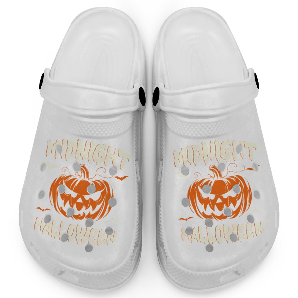 You are viewing an exclusive and elegant product Midnight Halloween Pumpkin Scary Jack-O-Lantern Clogs For Kids WHITE belong theme Clogs at Printblur
