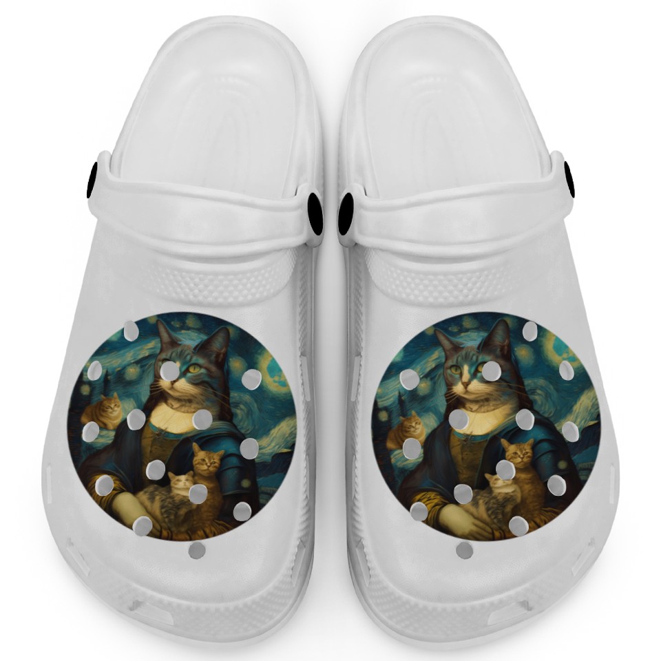 You are seeing a unique and impressive product Mona Lisa With Cats Starry Night Van Gogh Painting Clogs For Kids WHITE belong theme Clogs at Printblur