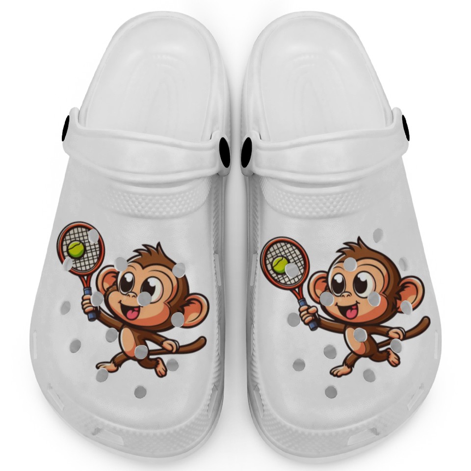 You're looking at the eye-catching product Monkeys in Tennis and Badminton Duel - Hilarious Clogs For Kids WHITE belong theme Clogs at Printblur