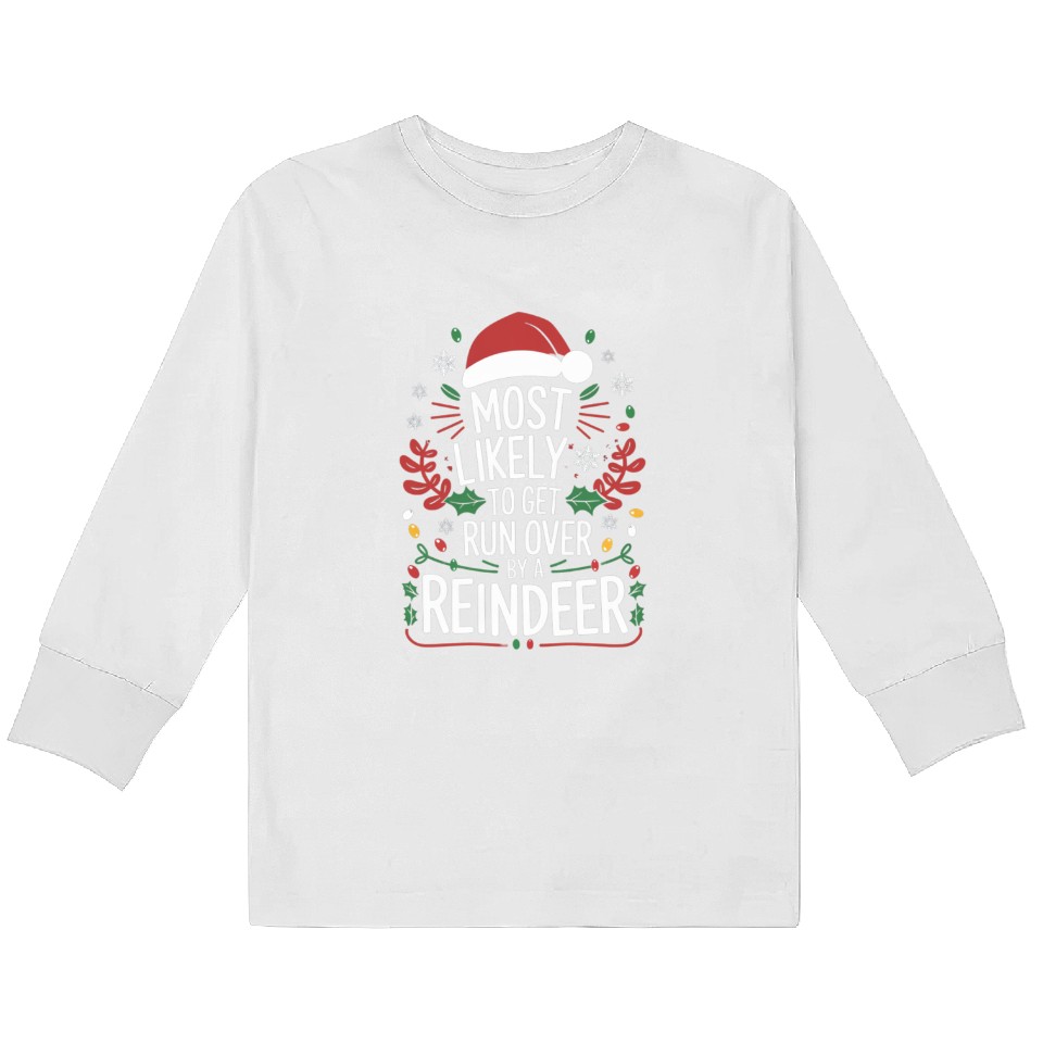 You're looking at the eye-catching product Most Likely To Get Run Over By A Reindeer Matching Kids Long Sleeve T Shirts For Kids WHITE belong theme Kids Long Sleeve T-Shirts at Printblur