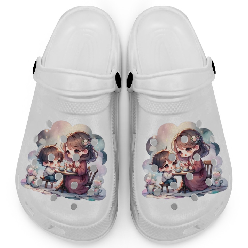 The item hot trend you're looking at is Mother and Son Enjoying a Cozy Tea Party Clogs For Kids WHITE belong theme Clogs at Printblur