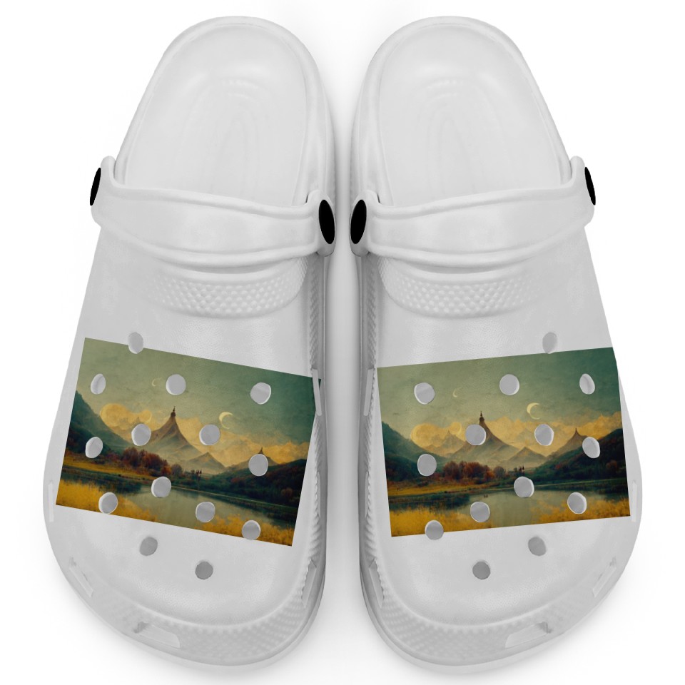 You are shopping for a stunning and trendy product Mountain Lake Golden Landscape Painting Clogs For Kids WHITE belong theme Clogs at Printblur