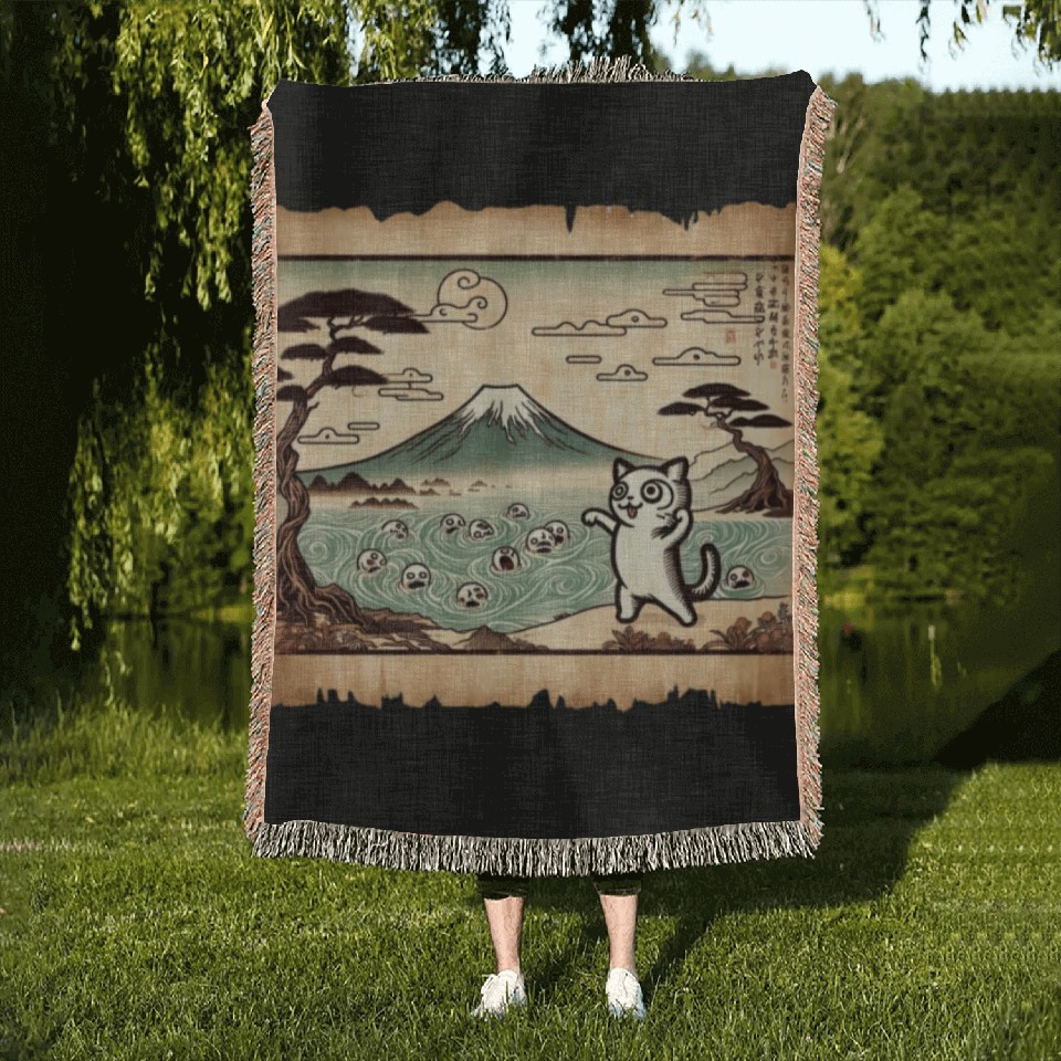 You're looking at the eye-catching product Mt. Fuji Kitten Papyrus Scroll Retro Japanese Art Woven Blankets For Black belong theme Woven Blankets at Printblur