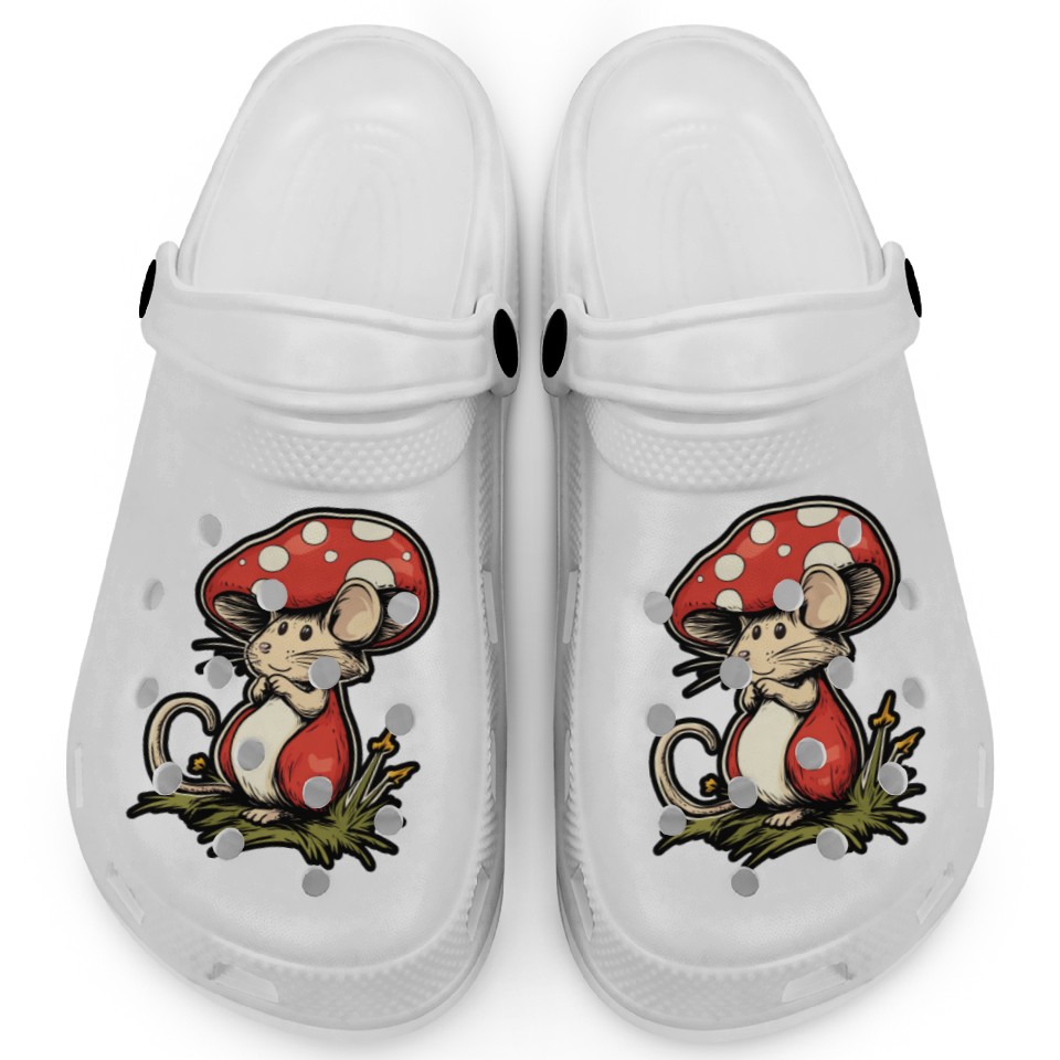 You're looking at the eye-catching product Mushroom Mouse Funny Animal And Mushroom Clogs For Kids WHITE belong theme Clogs at Printblur