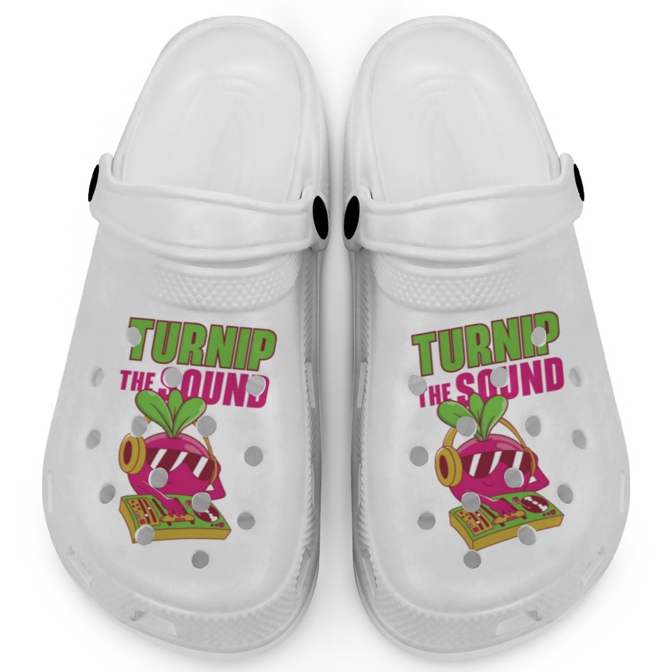 You're taking a peek at the product Music Turnip Party Music Lover Vegetable Clogs For Kids WHITE belong theme Clogs at Printblur