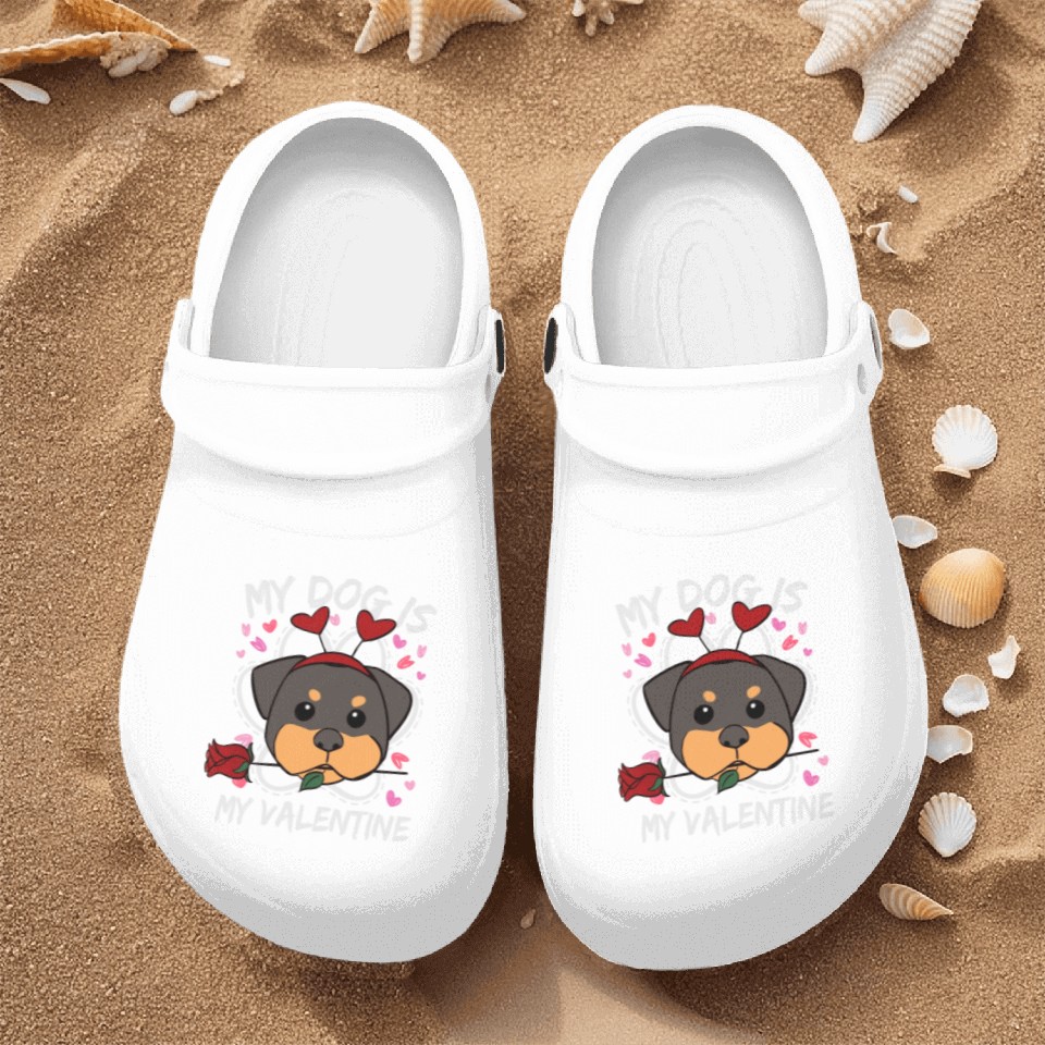 The item hot trend you're looking at is My Dog Is My Valentine Nurse Clogs For Men WHITE belong theme Nurse Clogs at Printblur