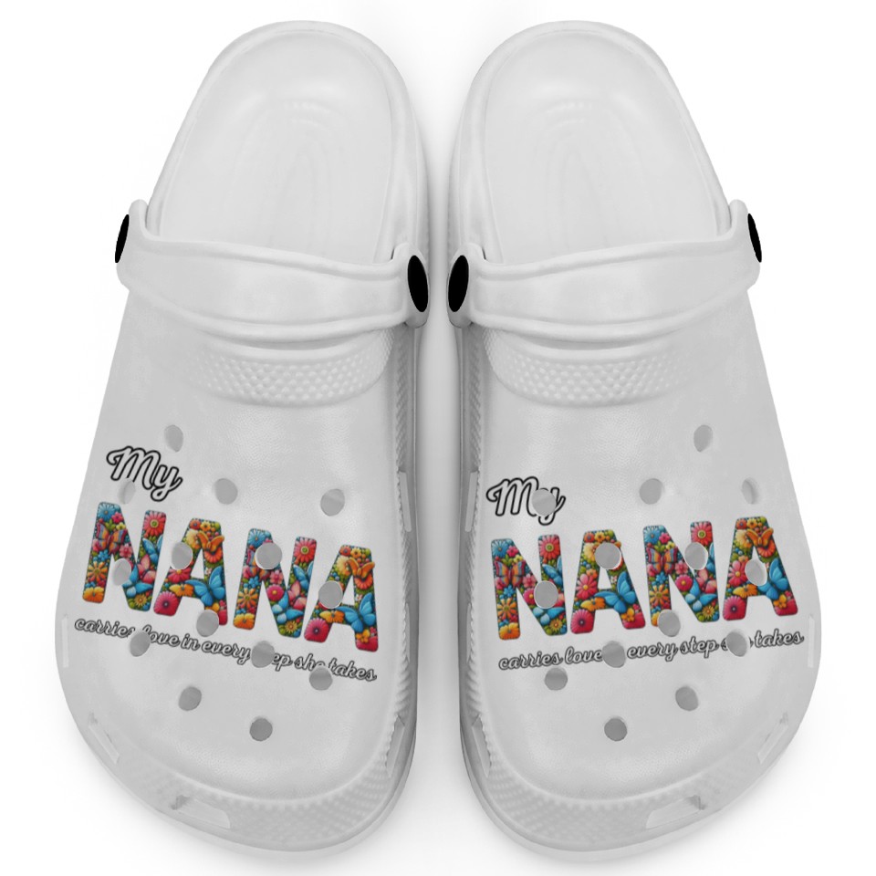 You are viewing one of the trendiest products My NANA carries love in every step she takes Clogs For Kids WHITE belong theme Clogs at Printblur