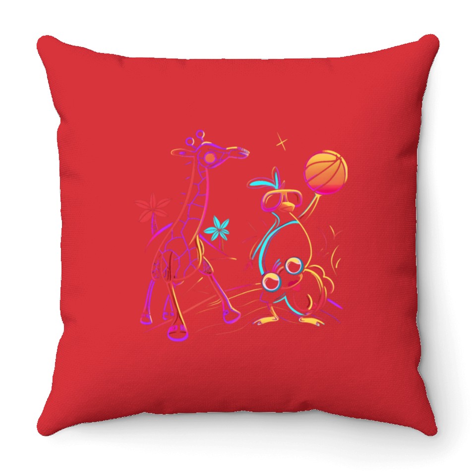 You are viewing an exclusive and elegant product Neon Showdown: Giraffe & Bird's Basketball Duel Throw Pillows For Cover Only Red belong theme Throw Pillows at Printblur