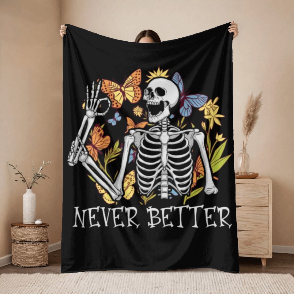 Shop for attractive Never Better Skeleton Funny Skeleton Halloween Throw Blankets or see more Throw Blankets products on https://printblur.com right now!
