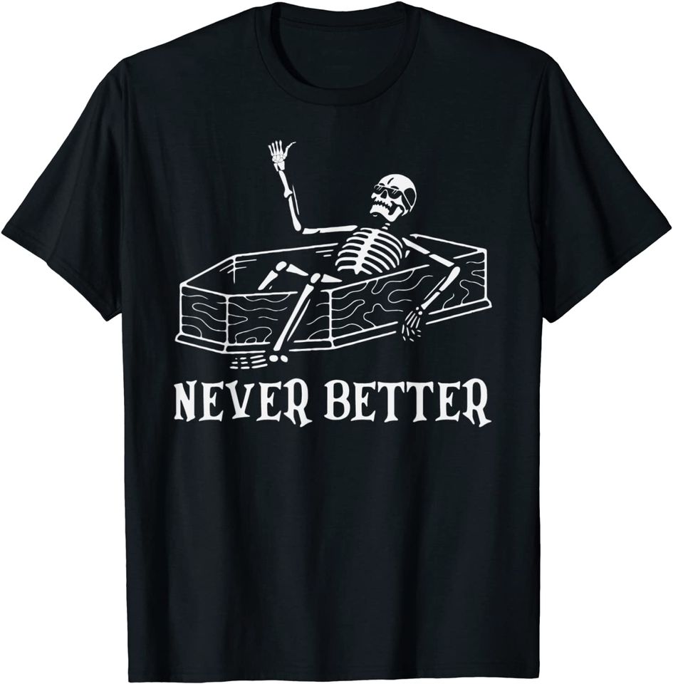 Own fascinating Never Better Skeleton in Coffin Funny Sarcastic Halloween T-Shirt or see more T-Shirts products now from Printblur shop to enjoy your shopping time!