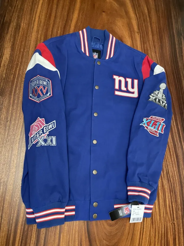 New Large Mens New York Giants 4 Time Super Bowl Champ Bomber Patch Jacket