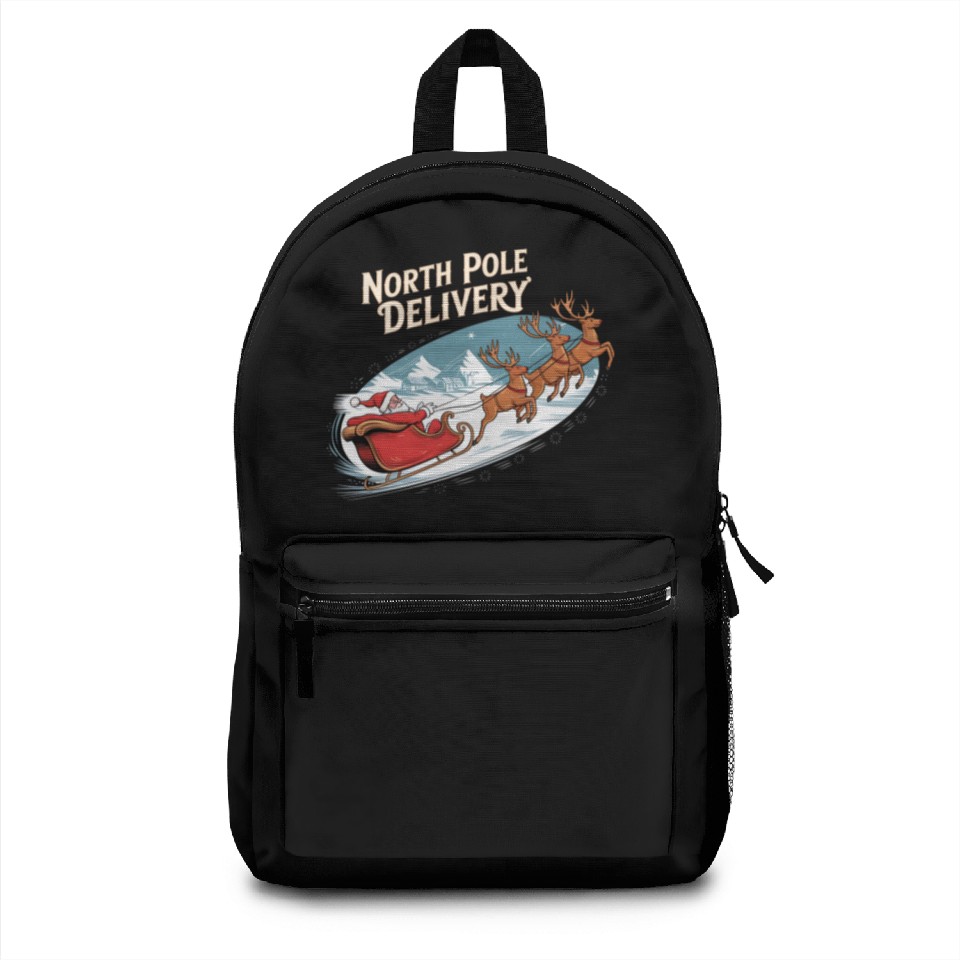 The product unique design you searched for is North Pole Delivery with Santa and Reindeer Backpacks For Black belong theme Backpacks at Printblur