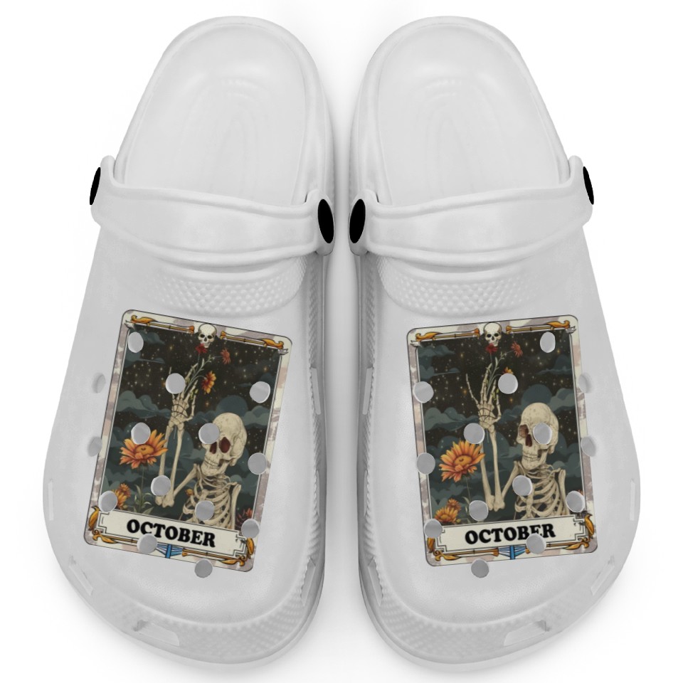 The product unique design you searched for is October Gothic Tarot Card - Marigold Flower & Skel Clogs For Kids WHITE belong theme Clogs at Printblur