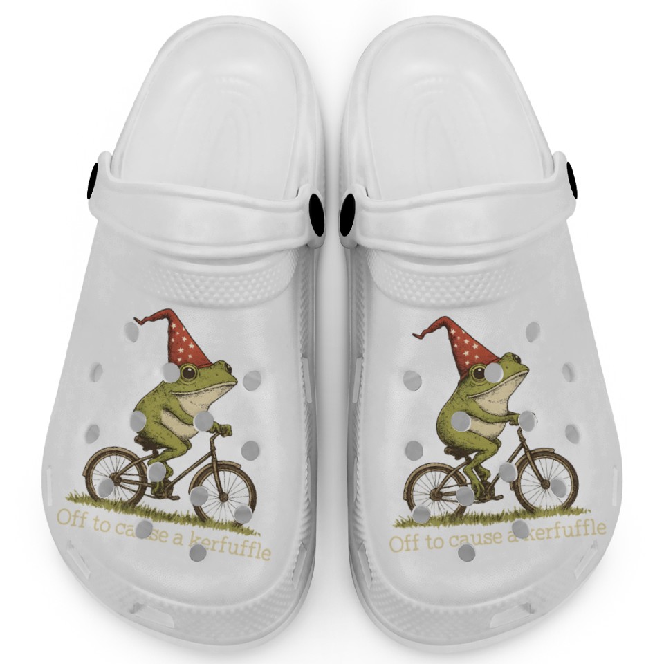 The product unique design you searched for is Off to Cause a Kerfuffle Frog Funny Weirdcore Clogs For Kids WHITE belong theme Clogs at Printblur