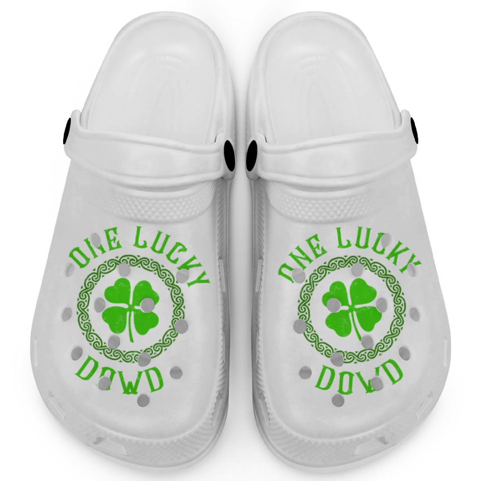 The product unique design you searched for is One Lucky Dowd Irish Family Four Leaf Clover Clogs For Kids WHITE belong theme Clogs at Printblur