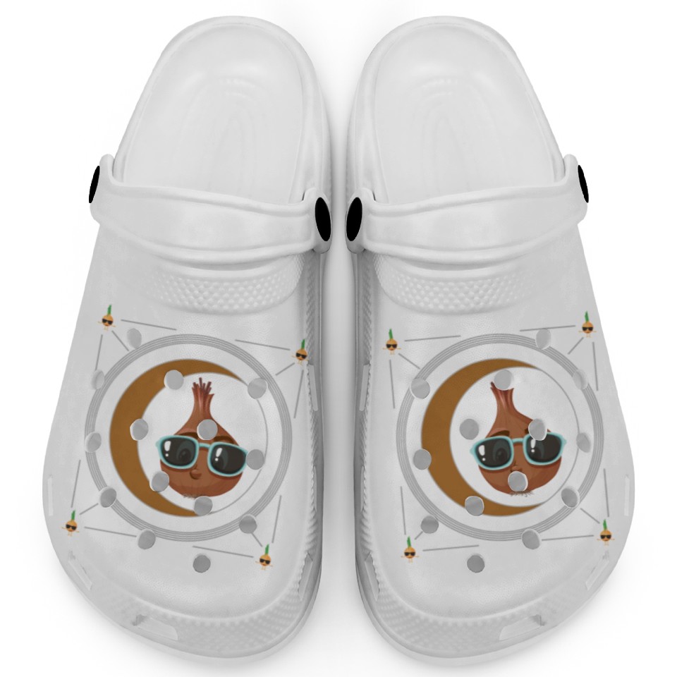 You are viewing an exclusive and elegant product Onion Vegetable Clogs, Onion Wearing Sunglasses For Kids WHITE belong theme Clogs at Printblur