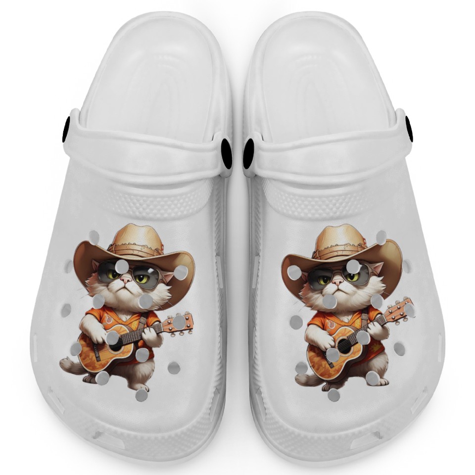 The item hot trend you're looking at is Orange Cowboy Cat with Guitar Clogs For Kids WHITE belong theme Clogs at Printblur