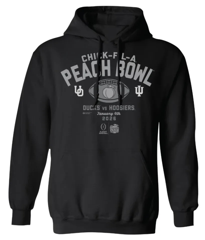 You're looking at the eye-catching product Oreg ducks vs Indiana 2026 Chick-Fil-A Peach Bowl Hoodie For Youth Black belong theme Hoodies at Printblur