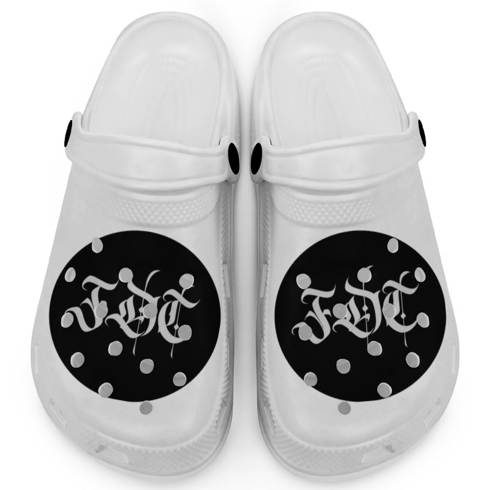 Shop for attractive Ornate Gothic Lettering FDT in Light Grey on Black Clogs or see more Clogs products on https://printblur.com right now!