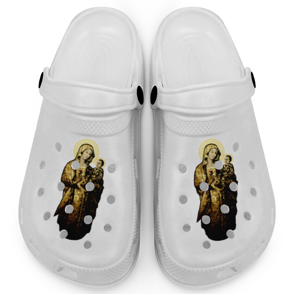 You're searching for a one-of-a-kind product Our Virgin Mother (and Son) Clogs For Kids WHITE belong theme Clogs at Printblur