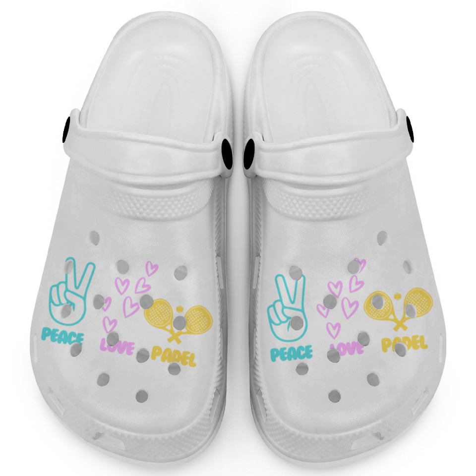 Shop for attractive Padel Tennis peace love padel design Clogs or see more Clogs products on https://printblur.com right now!