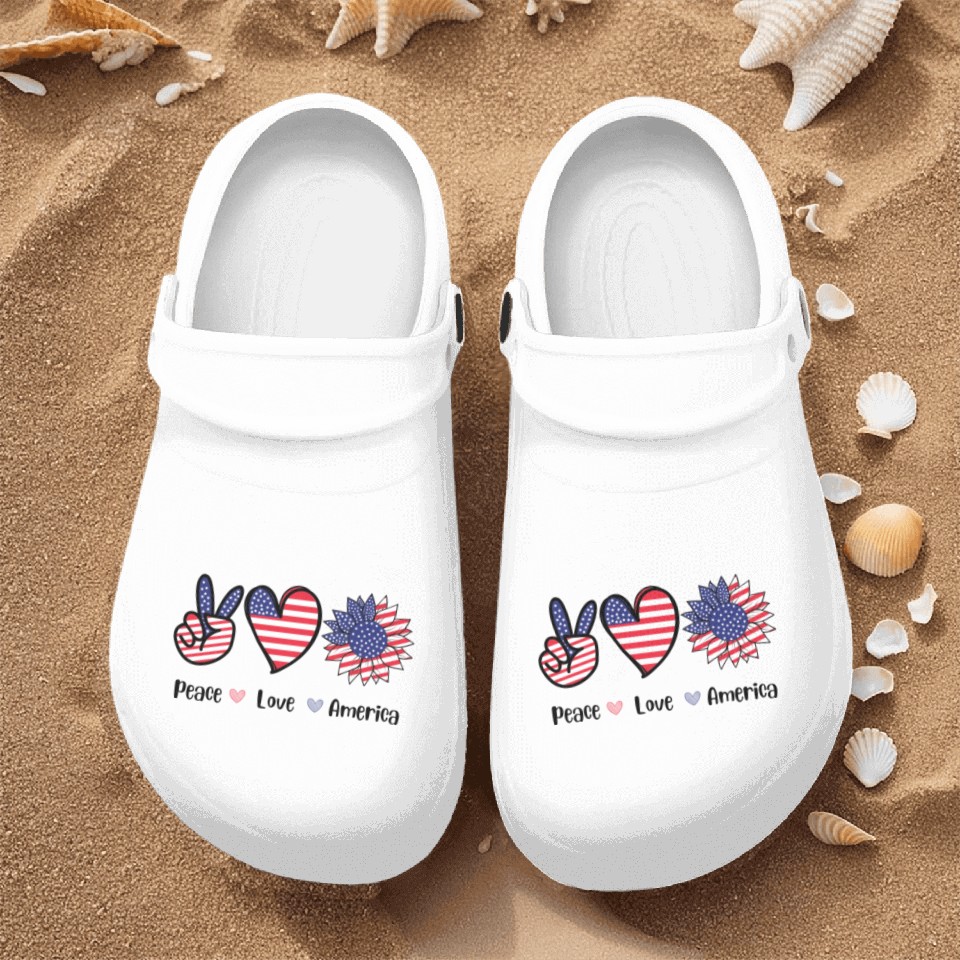 Buy eye-catching Peace Love America 4th July Gift Nurse Clogs Design or see more Nurse Clogs products at Printblur shop now to explore many surprises from our shop!