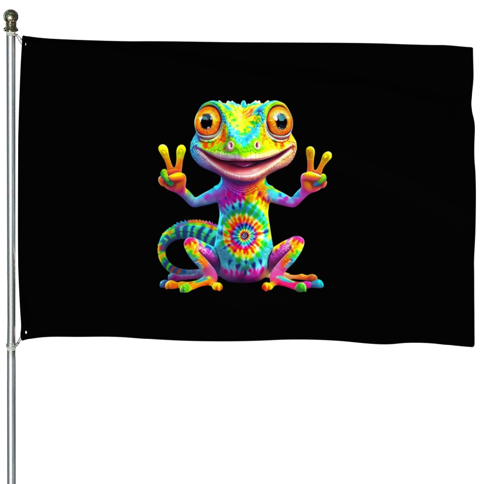You are viewing an exclusive and elegant product Peace, Love & Lizards – Tie-Dye Gecko Vibes House Flags For Black belong theme House Flags at Printblur