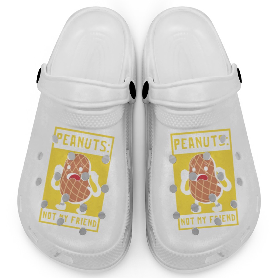 The product unique design you searched for is Peanuts Not My Friend Peanut Allergic Clogs For Kids WHITE belong theme Clogs at Printblur