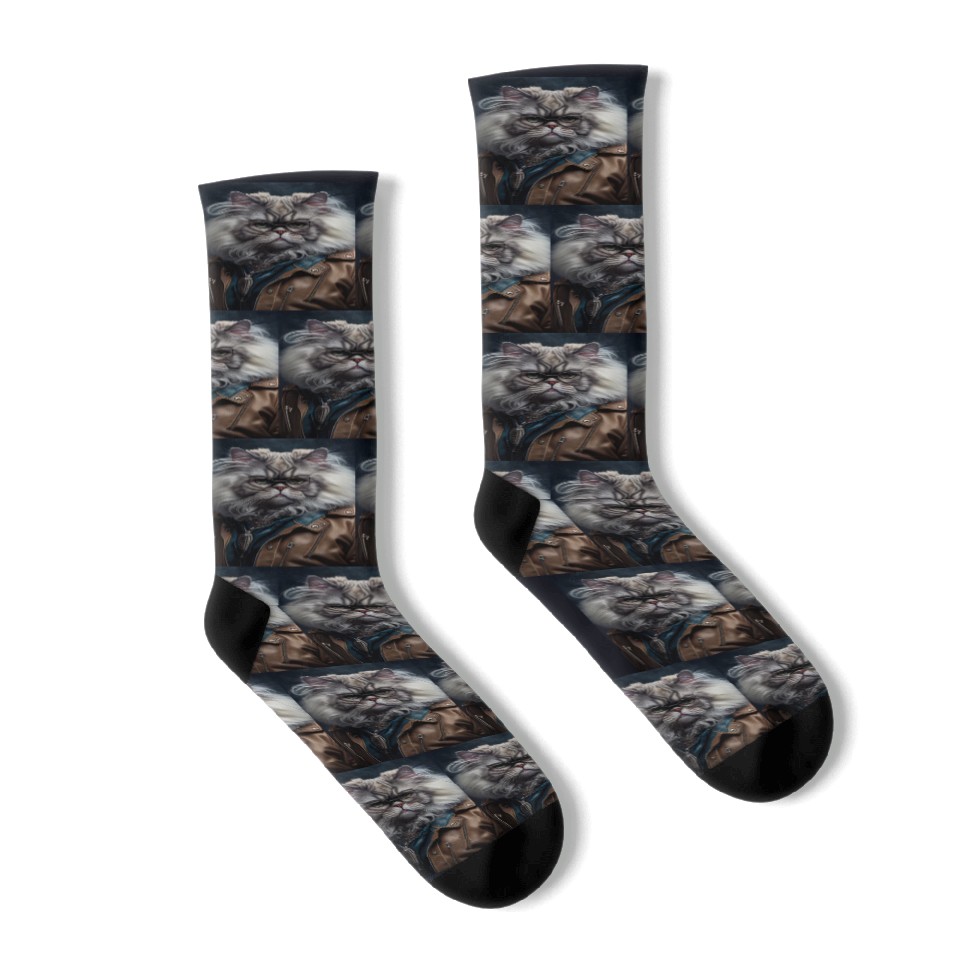 Buy eye-catching Persian Cat Breed Portrait wears a leather jacket Socks or see more Socks products at Printblur shop now to explore many surprises from our shop!
