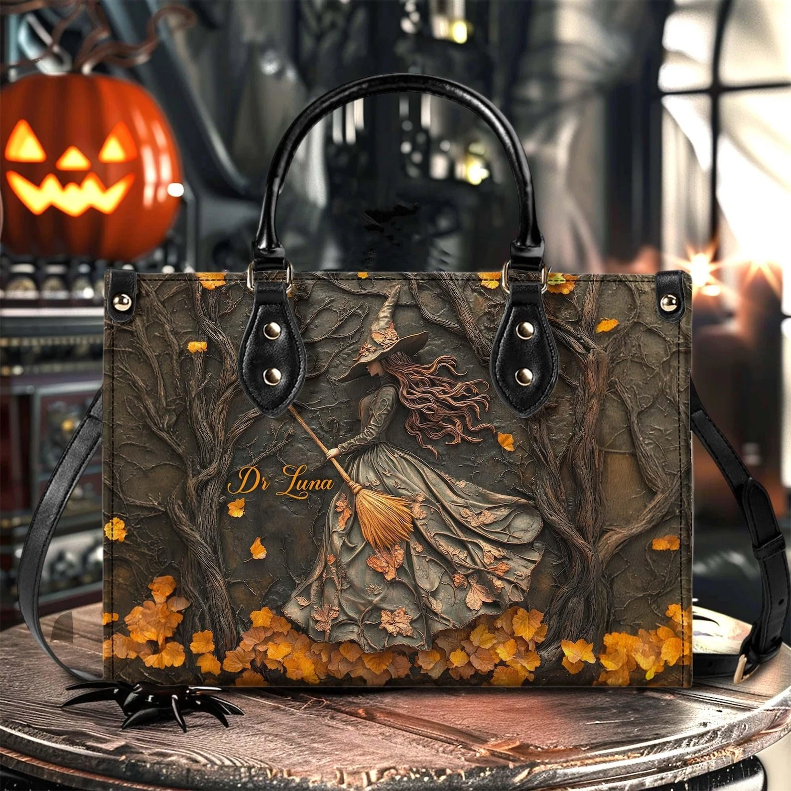 You are viewing an exclusive and elegant product Personalized Witch Art Print Handbag With Handle, Spooky Halloween Bags For belong theme PU Leather bags at Printblur