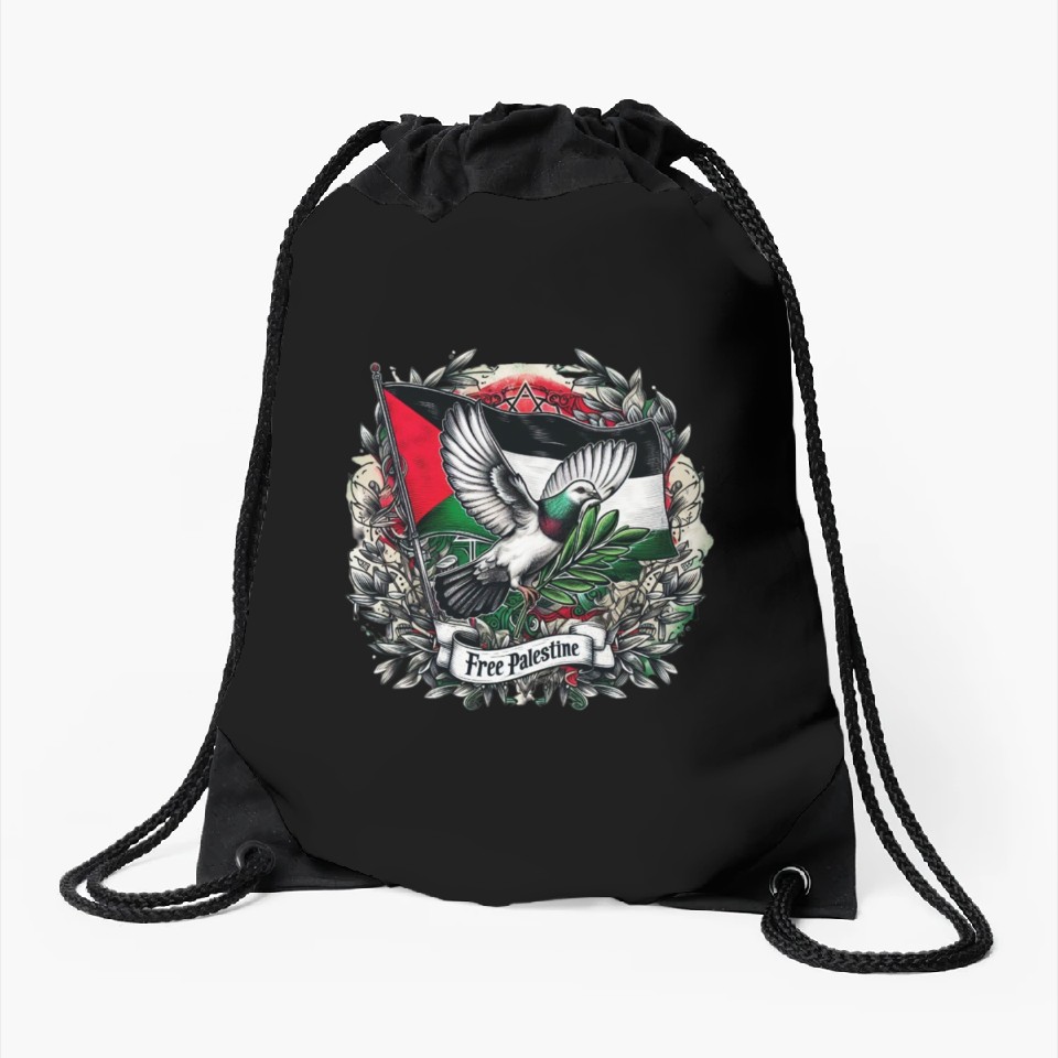 Buy eye-catching Pigeon holding olive's leaf free Palestine Flag Drawstring Bags or see more Drawstring Bags products at Printblur shop now to explore many surprises from our shop!