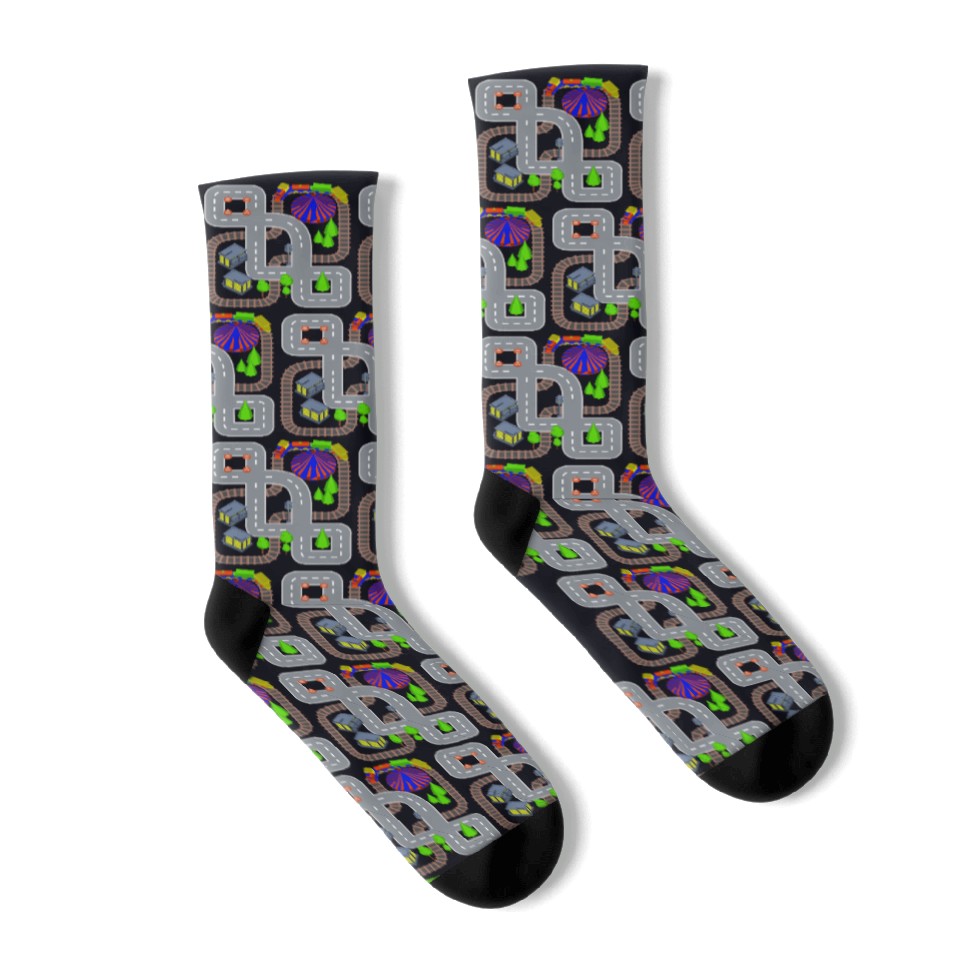You are viewing an exclusive and elegant product Playmat Train And Car Race Track On Daddy's Back Socks For Black belong theme Socks at Printblur