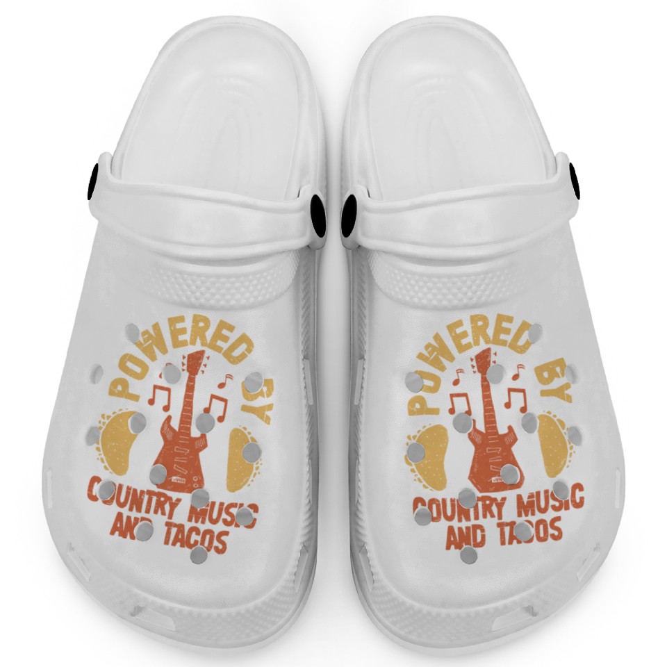 Buy eye-catching Powered By Country Music & Tacos Western Cowboy Clogs or see more Clogs products at Printblur shop now to explore many surprises from our shop!