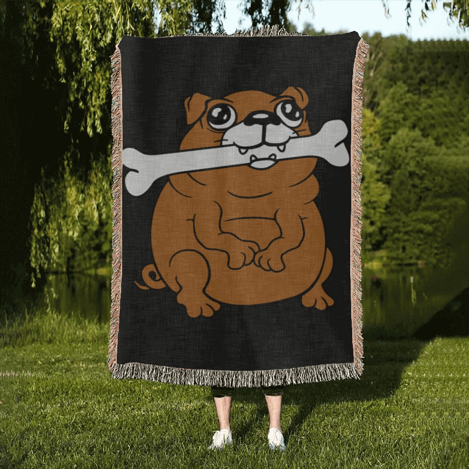 You are seeing a unique and impressive product Pug Dog Bone Mouth Hunger Delicious Happy Cool Fun Woven Blankets For Black belong theme Woven Blankets at Printblur