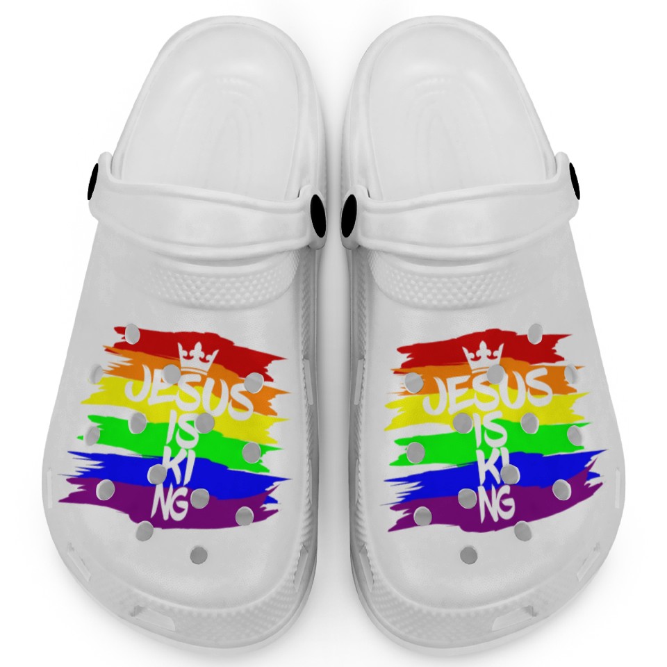 Buy eye-catching Queer Jesus is King Cross Crown Rainbow Colors Clogs or see more Clogs products at Printblur shop now to explore many surprises from our shop!