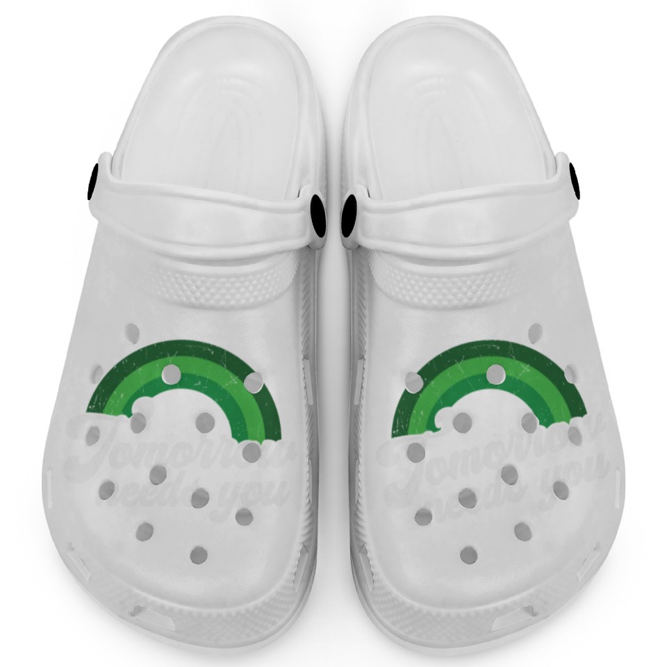 The item hot trend you're looking at is Rainbow Mental Health Tomorrow Needs You Clogs For Kids WHITE belong theme Clogs at Printblur