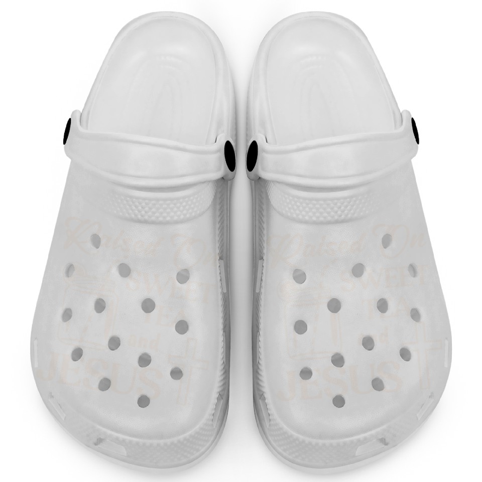 You're taking a peek at the product Raised On Sweet Tea And Jesus LIKE US ON FACEBOOK Clogs For Kids WHITE belong theme Clogs at Printblur
