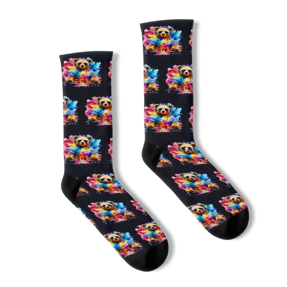 Elevate your sock game with our custom all-over-print (AOP) mid-calf socks. Crafted from a flexible 90% polyester, 10% spandex blend, these socks offer a comfortable, long-lasting fit.