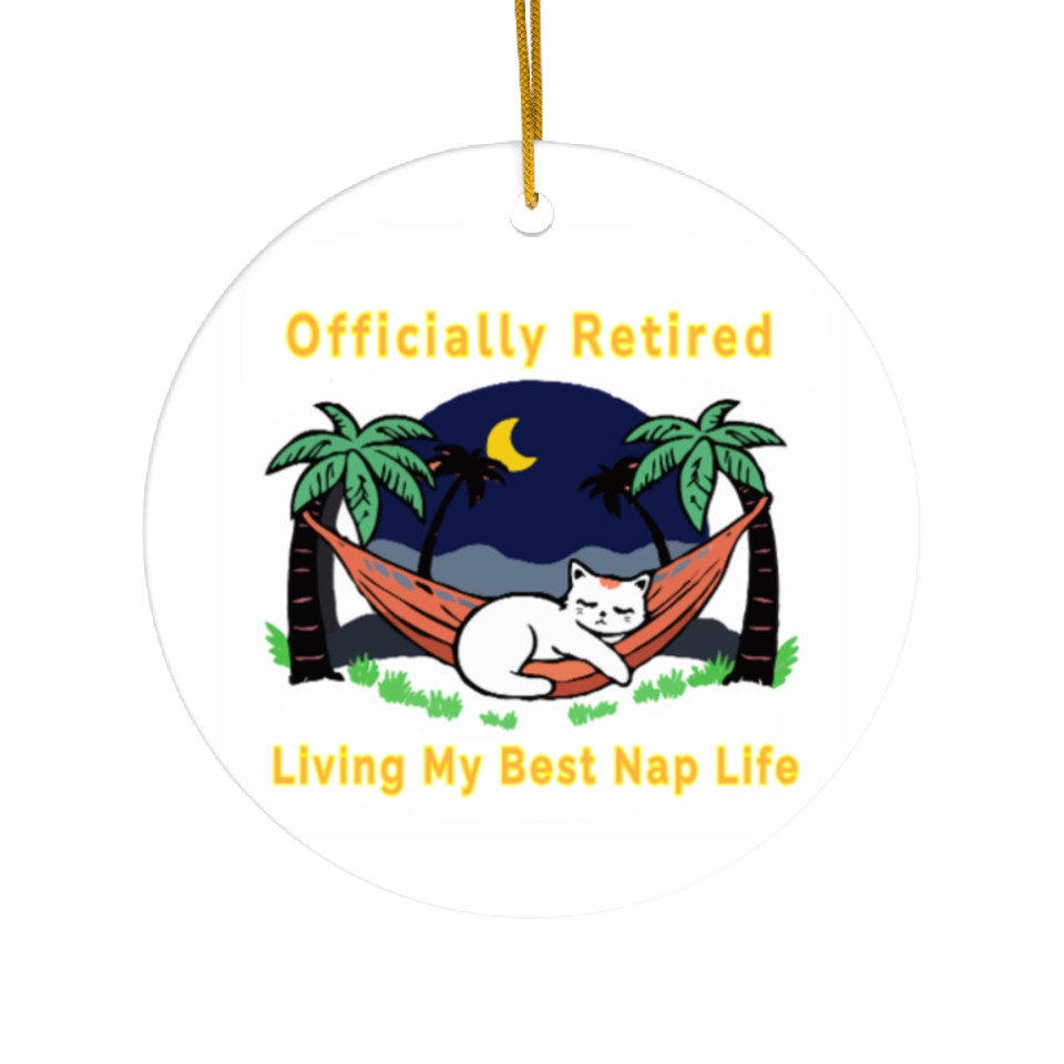 You're looking at the eye-catching product Retired Cat - Living the Dream Ceramic Ornaments For WHITE belong theme Ceramic Ornaments at Printblur