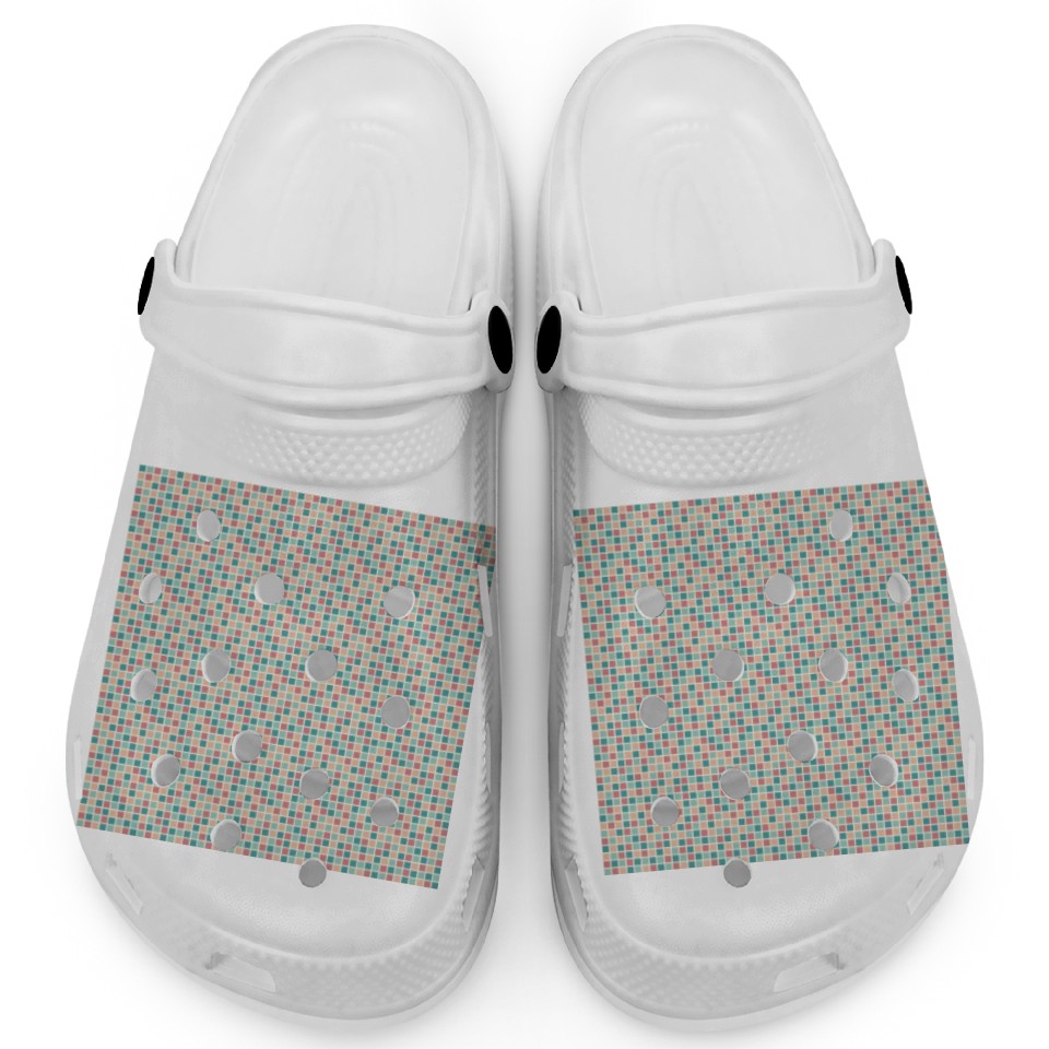 You are shopping for a stunning and trendy product Retro Checkered Pattern Yellow Teal Coral Clogs For Kids WHITE belong theme Clogs at Printblur