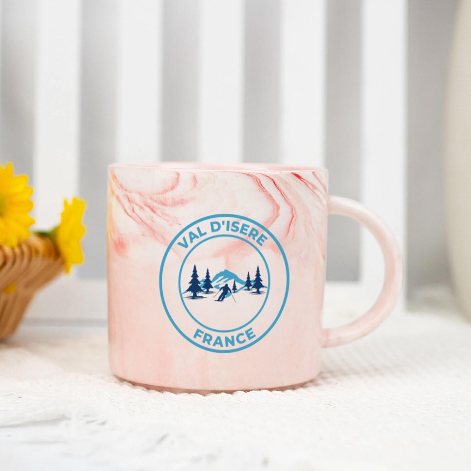 You are shopping for a stunning and trendy product Retro cool Skiing in Val d'Isere France Marble Mugs For Pink belong theme Marble Mugs at Printblur
