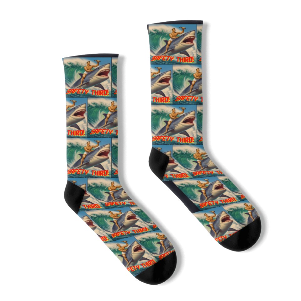 Shop for impressive Retro Safety Third Shark Rodeo Socks or see more Socks products right now on Printblur to enjoy your happiness!