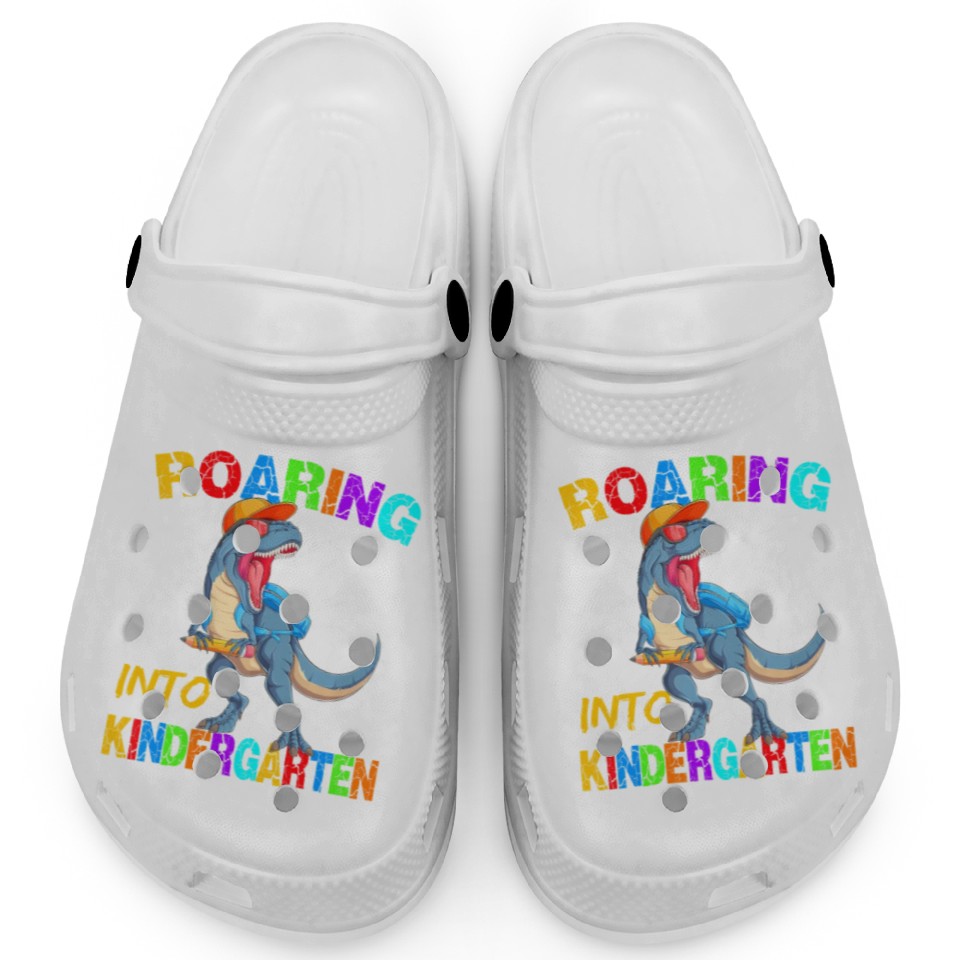 You are seeing a unique and impressive product Roaring Into Kindergarten T Rex Dinosaur Back To S Clogs For Kids WHITE belong theme Clogs at Printblur