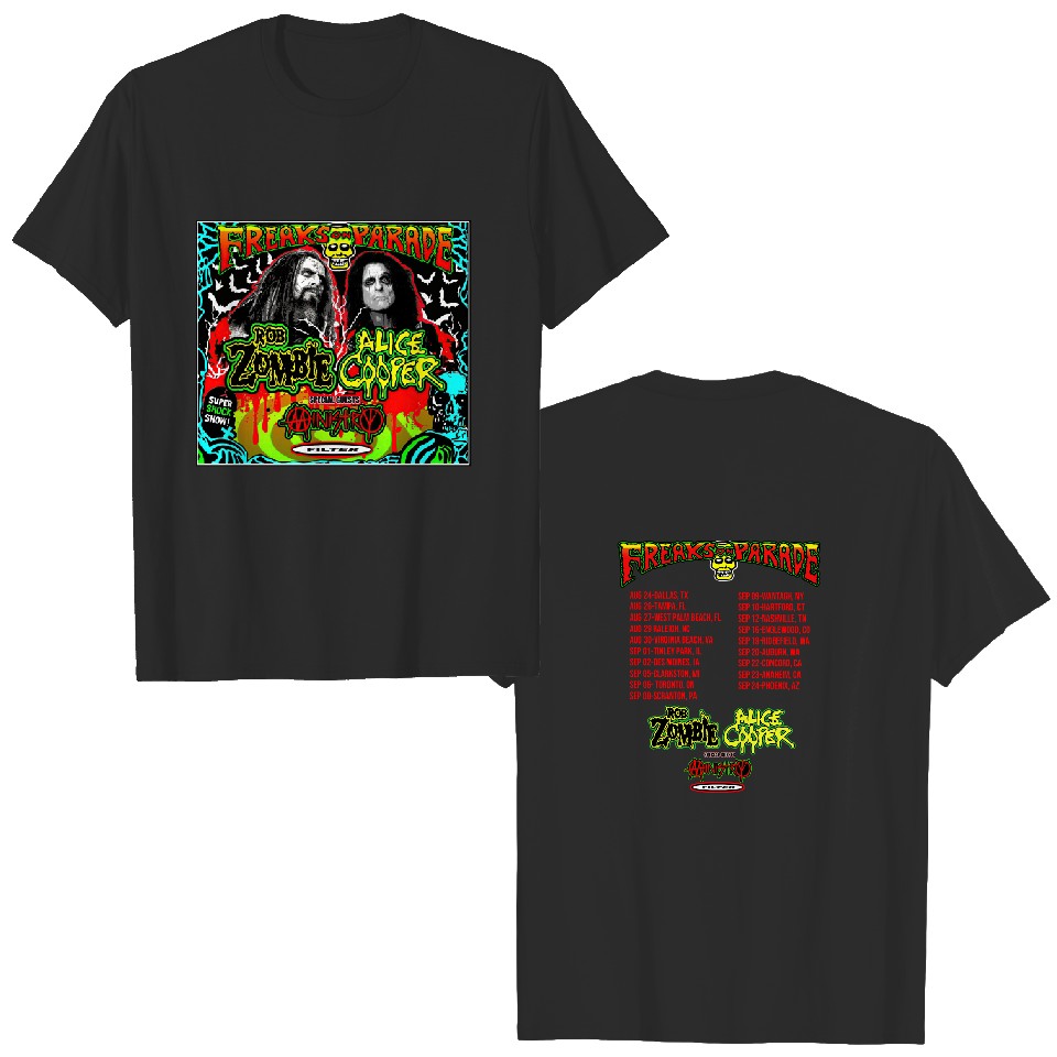 The item hot trend you're looking at is Rob Zombie and Alice Cooper Freaks on Parade Tour Shirt For Men Black belong theme Double Sided T-Shirts at Printblur
